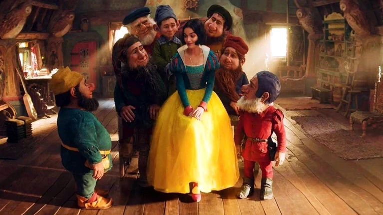 È la prima volta che i nani in live-action appaiono nella loro interezza, completamente creati con effetti CGI. La foto vede la Zegler, interprete di West Side Story e Shazam: furia degli Dei, seduta in un accogliente cottage, accompagnata da Brontolo, Mammolo, Dotto, Pisolo, Cucciolo, Eolo e Gongolo.