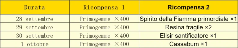 I bonus arriveranno in 4 tranche, una al giorno dal 28 Settembre al 1° Ottobre: ciascuna tranche fornirà al log-in la bellezza di 400 Primogemme più un altro bonus, secondo la seguente tabella: