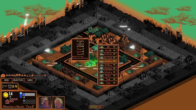 La prima cosa che salta all’occhio avviando Kaiju Wars è la magnifica presentazione. Il menu principale è situato in questo enorme ufficio tridimensionale e interattivo, unica nota “moderna” in un canovaccio altrimenti fortemente ancorato alle sue origini 8-bit. Di fronte al giocatore la sua scrivania, con tutti gli “attrezzi del mestiere”, tra cui il già citato almanacco con i livelli di gioco; a lato una bacheca con sfide “retrò” aggiuntive, ispirate a titoli passati del genere. Sullo sfondo una serie di tv che trasmettono in loop notiziari da tutto il mondo: servizi interpretati da persone in carne ed ossa e pure piuttosto plausibili, non fosse per il tono tanto fatalista quanto ironico. Riuscitissima anche la grafica dei campi di battaglia, con enormi sprite monocromatici e molto dettagliati, caratterizzati da forti contrasti e tinte accese che danno ai primi capitoli un tono quasi “vaporwave”, di grande atmosfera. Atmosfera rafforzata dall’ottima colonna sonora, che vanta una scaletta orecchiabile, variegata e sempre in linea con l’ambientazione o il contesto proposti. L’azione è leggibile, strutture e unità si riconoscono al volo anche senza zoomare, le animazioni e gli effetti sonori sono minimali ma ricchi di personalità, un quadro nel complesso ricco di stile e perfetto per accompagnare le sessioni.