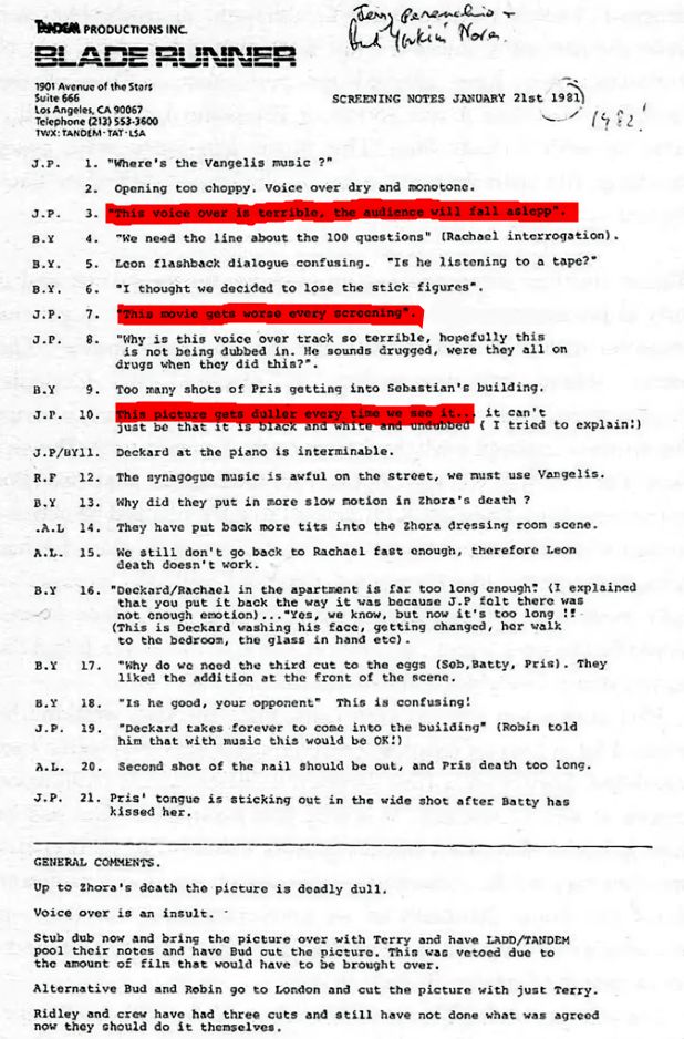 Per Ridley Scott il montaggio fu un campo di battaglia. Tandem pretendeva modifiche radicali: tagli, riscritture, il “famigerato” voice-over di Harrison Ford e un finale “ottimista” che andava contro la natura stessa del film. Ford registrò la narrazione malvolentieri, sperando che non venisse usata. Invece venne imposta. La relazione tra Scott e i produttori si deteriorò al punto che un memo di Perenchio definiva il film “più noioso ogni volta che lo vediamo”, lamentandosi anche della performance vocale dell’attore protagonista, definita “da drogato”. Voluto o meno, fu proprio il tono indolente ad aumentare il senso di sofferenza del personaggio.