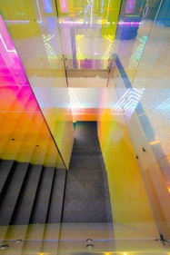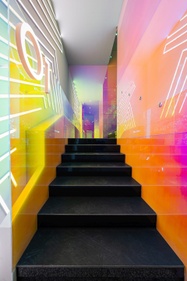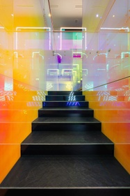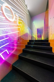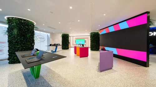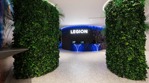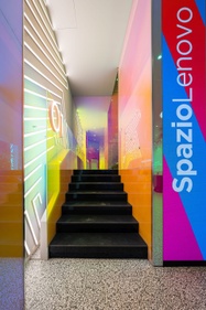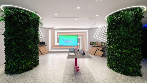 Nella progettazione di Spazio Lenovo, grande attenzione è stata riservata anche all’impatto ambientale, partendo dal design degli spazi e dai materiali utilizzati. Il progetto di Spazio Lenovo, affidato al pluripremiato designer italiano Alessandro Luciani, prevede la possibilità di sperimentare la tecnologia attraverso percorsi emozionanti, esperienziali ed immersivi; design e colori hanno l’obiettivo di far convivere due approcci. Il primo parla di tecnologia e futuro, che prendono forma in una comunicazione tutta digitale con riflessi, scritte, grandi schermi e ledwall; il secondo parla di sostenibilità, in un’ambientazione che mira ad accorciare le distanze con l’ambiente esterno grazie all’utilizzo di materiali sostenibili come il ferro, il vetro, il legno, e il vetro dicroico con i suoi effetti cromatici e riflettenti, che rievoca lo spettro solare e il suo cambio cromatico nell’arco della giornata. Completano l’ambientazione le 13 colonne rivestite di verde verticale stabilizzato che si innalzano come alberi.