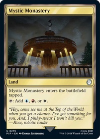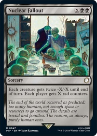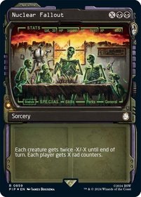 Magic: The Gathering – Fallout celebra l’intera saga videoludica di Fallout®, dal 1997 fino a Fallout'76. Il set rappresenta la prima visione moderna di alcuni dei classici giochi di Fallout, inclusi gli aggiornamenti ai personaggi e alle ambientazioni di Fallout e Fallout 2. Un set che rende omaggio alle radici di quel gioco di ruolo post-atomico ad alta energia e azione che è Fallout. Che tu ti unisca ad alcuni dei personaggi più famigerati di Fallout o scelga di giocare nei panni di un sopravvissuto del Vault che combatte bande di predoni, supermutanti, mostri irradiati e robot prebellici, la vita nelle terre desolate non sarà facile!