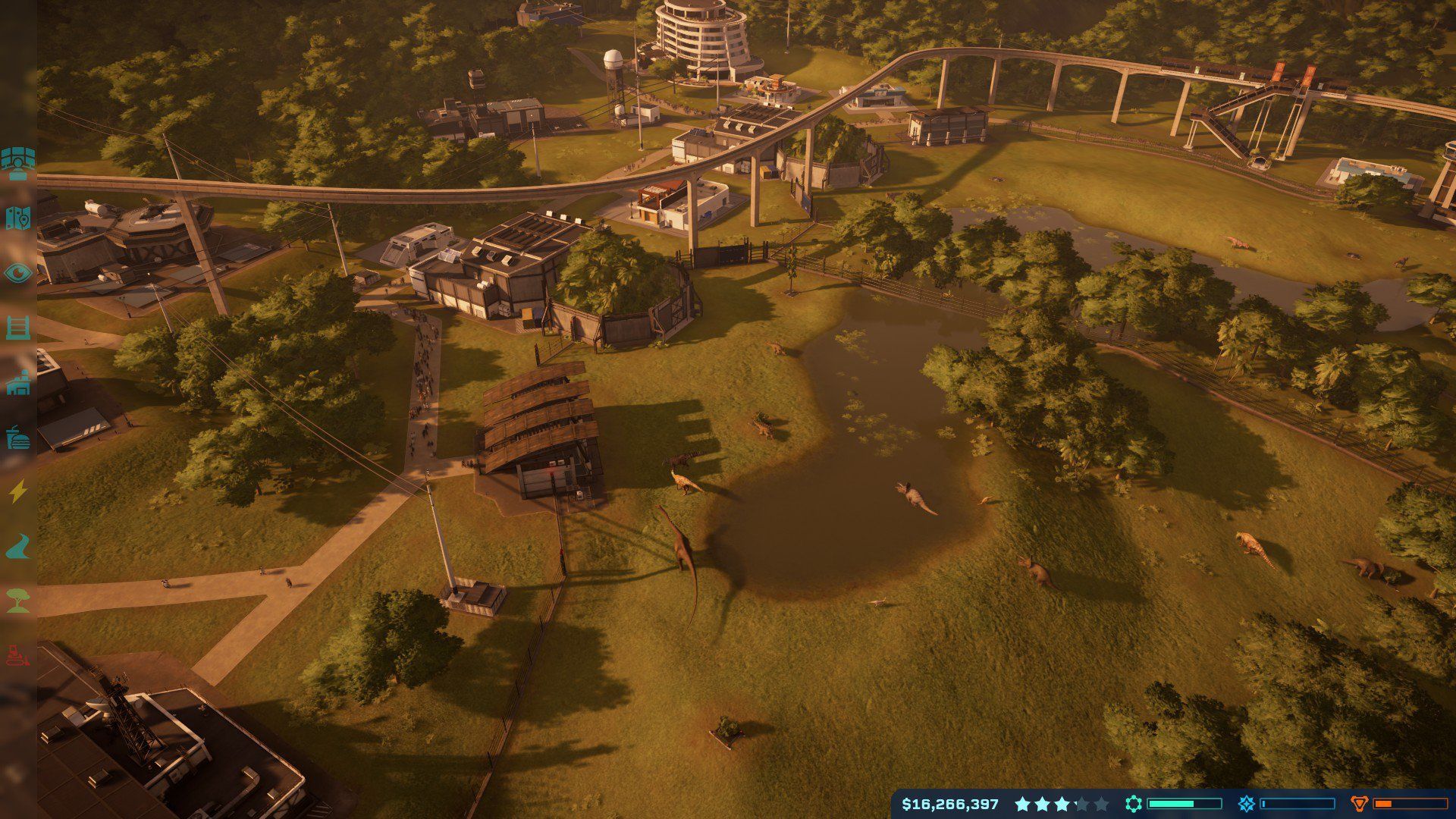 Il gameplay di JWE si sviluppa principalmente su tre livelli. Il primo è quello classico del genere in cui dovremo costruire, più o meno da zero, le infrastrutture necessarie al parco per poter funzionare in sicurezza ed attirare l’attenzione del pubblico. Nell’assolvere a questo compito avremo massima libertà di scelta sul dove e come posizionare edifici, recinzioni e sentieri, ponendo però particolare attenzione alle due principali risorse richieste: l’energia, che dovremo ottenere costruendo centrali elettriche e distribuirla con gli appositi piloni, e i soldi, che otterremo vendendo i biglietti ai nostri ospiti e svolgendo una serie di missioni “secondarie”. Potremo quindi plasmare a nostro piacimento lo spazio messo a disposizione popolando i recinti con i nostri dinosauri preferiti, allestendo zone panoramiche e di relax per i nostri ospiti, negozi di souvenir, fast-food e attrazioni appassionanti (per il pubblico), come la “caccia alla pecora” da parte del T-rex affamato.