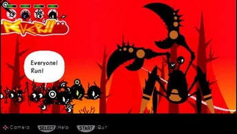 Agli occhietti mattatori di Patapon, dall'alto delle loro fattezze simboliche, bastano un abbozzo di palpebra e uno strano copricapo puntuto per acquisire un cipiglio battagliero che sprizza determinazione; l'emulazione di un segno inequivocabile del linguaggio facciale, nello spazio di pochi pixel. La marcia compatta delle creaturine, dagli arti brevilinei che si confanno al disegno infantile e brandiscono lance, archi, spade e un'orgoglioso stendardo, richiama la coesione tribale nel rito della guerra; alla stregua dei trecento spartani alle Termopili o degli scozzesi indomiti di Braveheart, ma attraverso una rappresentazione ricondotta all'essenziale, ripulita da ogni forma di esplicita brutalità, sdrammatizzata fino ad una divertita innocenza e ad un sentimento genuino.