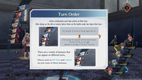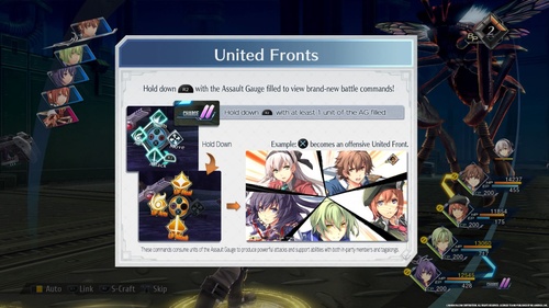 A livello di party, invece, saranno due i parametri da tenere d'occhio: i BP (Battle Points) e la Assault Gauge. I primi possono essere utilizzati per attivare degli “ordini” che garantiscano dei bonus di varia natura al party per un certo numero di turni; in alternativa, i BP vengono spesi nel momento in cui si attiva una mosso “di combo” tra i personaggi che avete impostato come “appaiati”. La seconda è una barra che può essere spesa per iniziare lo scontro con un “triplo vantaggio”, oppure per effettuare delle azioni di gruppo denominate United Fronts che coinvolgono non solo tutto il Party ma anche le riserve, portando dunque fino a 8 personaggi a menare le mani in concomitanza. Per quanto riguarda le abilità a disposizione dei PG, il gioco sfrutta sia il canonico livello di esperienza sia un sistema di Quarzi che, in maniera simile ai Materia di FFVII, garantiscono bonus e abilità a chi li equipaggia, potendosi potenziare anch'essi con l'esperienza. Non mancano infine sistemi di modifica e di fusione delle armi per ottenere ulteriori potenziamenti.